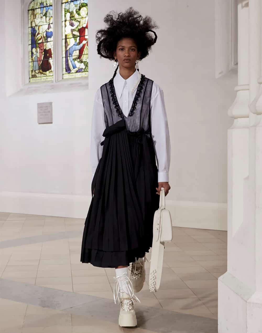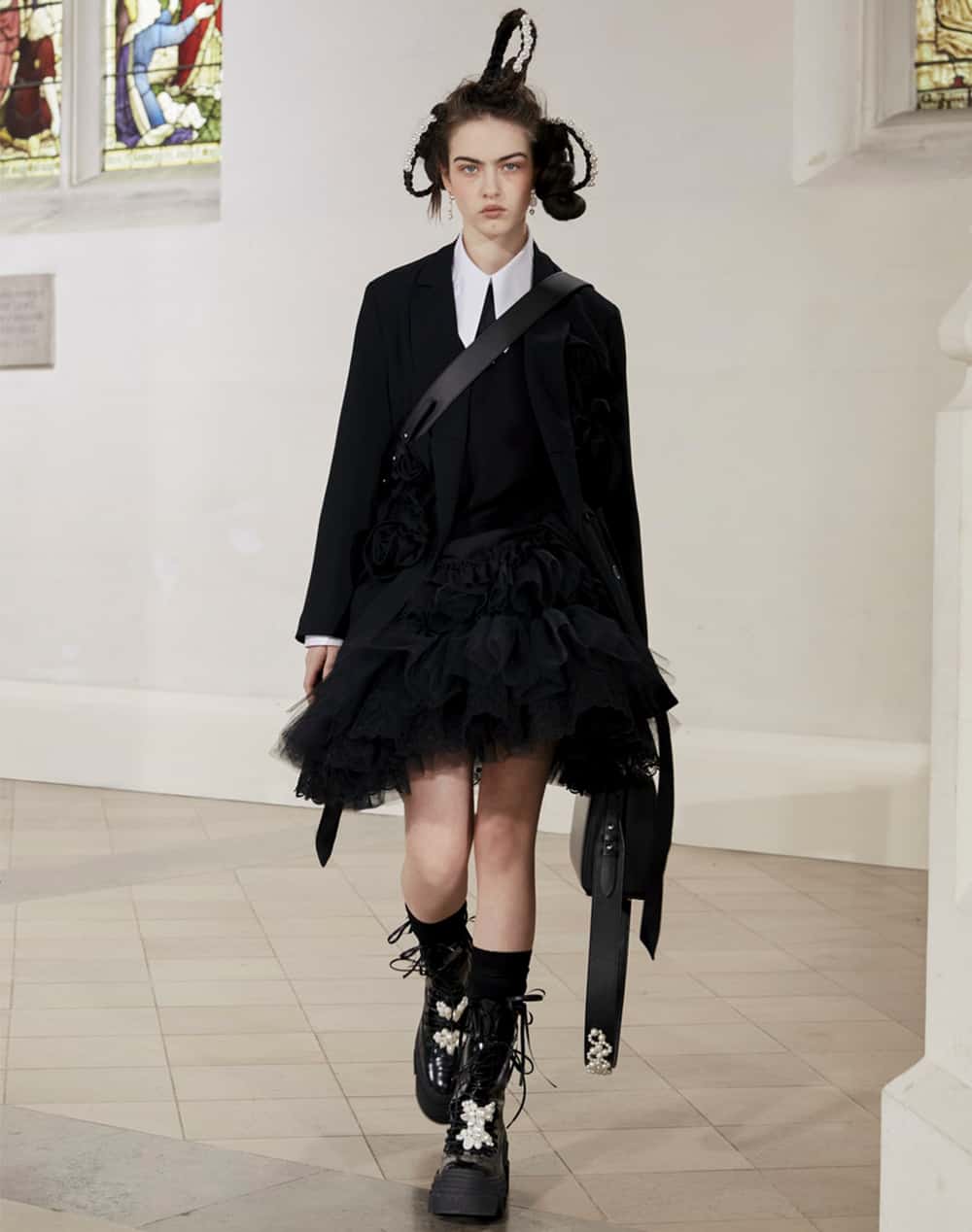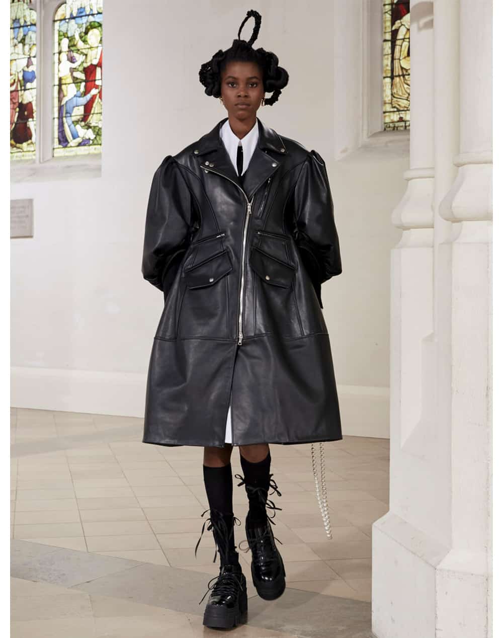 В то время как Вивьен Вествуд – это, несомненно, панк-икона, ирландку Симон Роша называли «a little punk princess» (маленькая панк-принцесса), а также «fragile rebel» (хрупкая бунтарка). Показа её коллекции ждали с особым нетерпением, ведь совсем скоро выйдет её коллаборация с H&M. Бренд Simone Rocha начинал с эстетики некоего школьного протеста, однако локдаун наложил особый отпечаток на почерк дизайнера. Ранее Симон вдохновлялась школьной формой, но теперь её дочь сидит дома: «Она скучает по нахождению в обществе, не надевает свою форму, – рассказывает Симон Роша. – Но всё это даёт ей возможность обрести свою личность, в том числе и с помощью одежды». В результате дизайнер соединила хрупкую женственность с грубыми байкерскими элементами. В коллекции встречаются белоснежные накрахмаленные рубашки в сочетании с чёрной кожей и рукавами в духе 80-х.