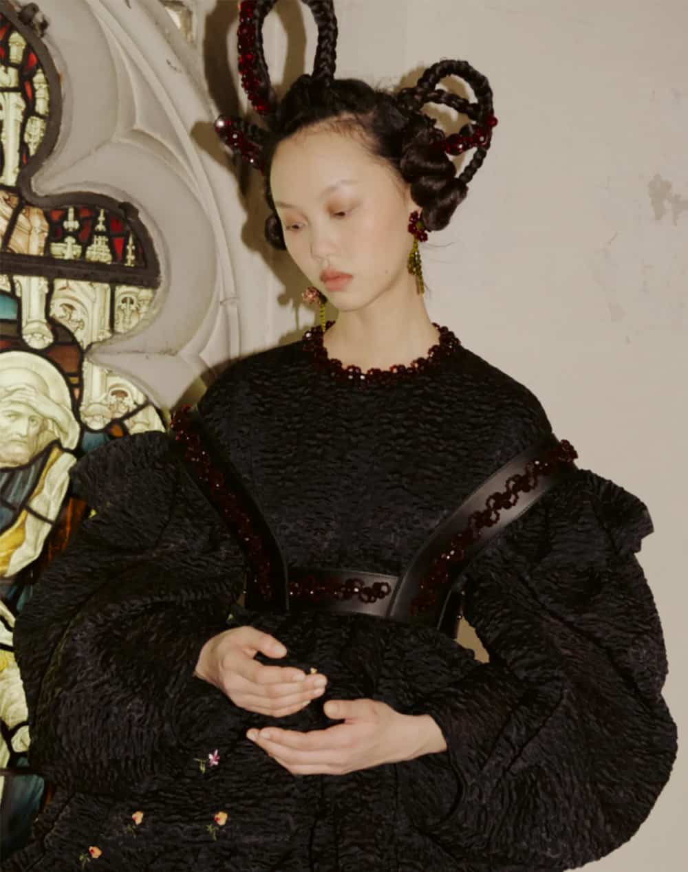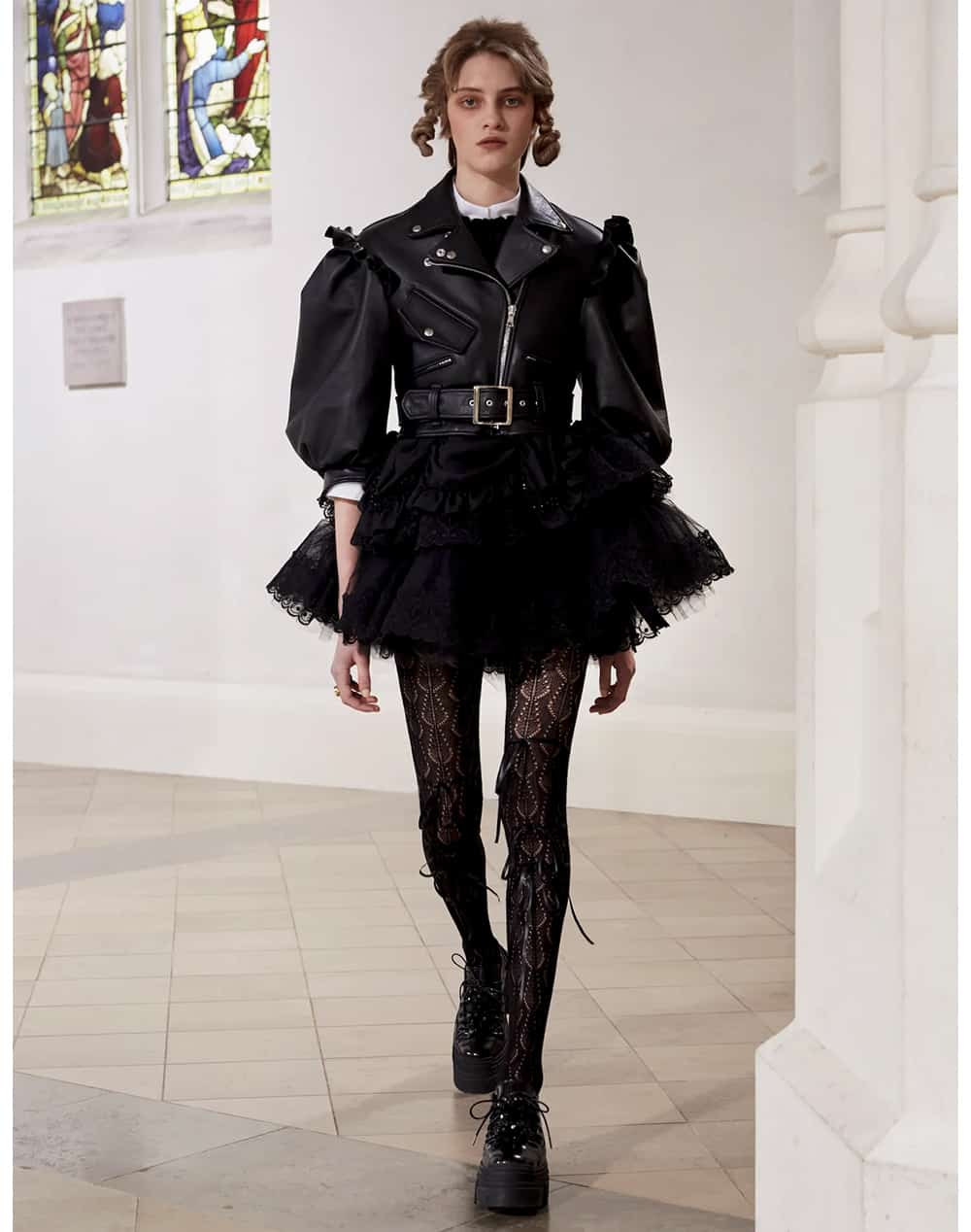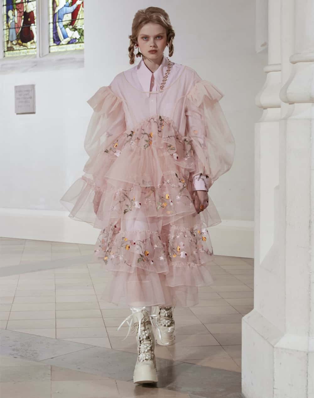 В то время как Вивьен Вествуд – это, несомненно, панк-икона, ирландку Симон Роша называли «a little punk princess» (маленькая панк-принцесса), а также «fragile rebel» (хрупкая бунтарка). Показа её коллекции ждали с особым нетерпением, ведь совсем скоро выйдет её коллаборация с H&M. Бренд Simone Rocha начинал с эстетики некоего школьного протеста, однако локдаун наложил особый отпечаток на почерк дизайнера. Ранее Симон вдохновлялась школьной формой, но теперь её дочь сидит дома: «Она скучает по нахождению в обществе, не надевает свою форму, – рассказывает Симон Роша. – Но всё это даёт ей возможность обрести свою личность, в том числе и с помощью одежды». В результате дизайнер соединила хрупкую женственность с грубыми байкерскими элементами. В коллекции встречаются белоснежные накрахмаленные рубашки в сочетании с чёрной кожей и рукавами в духе 80-х.