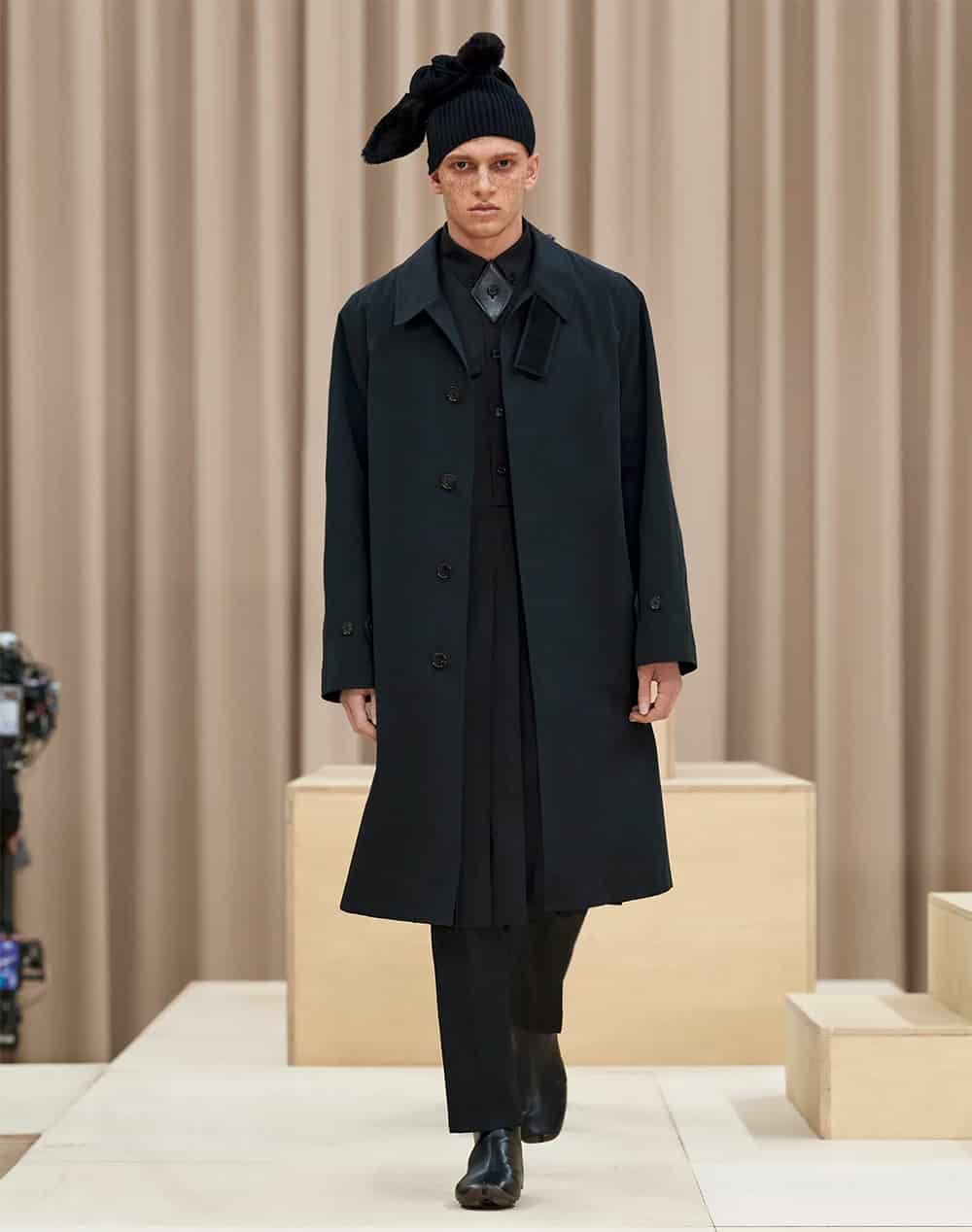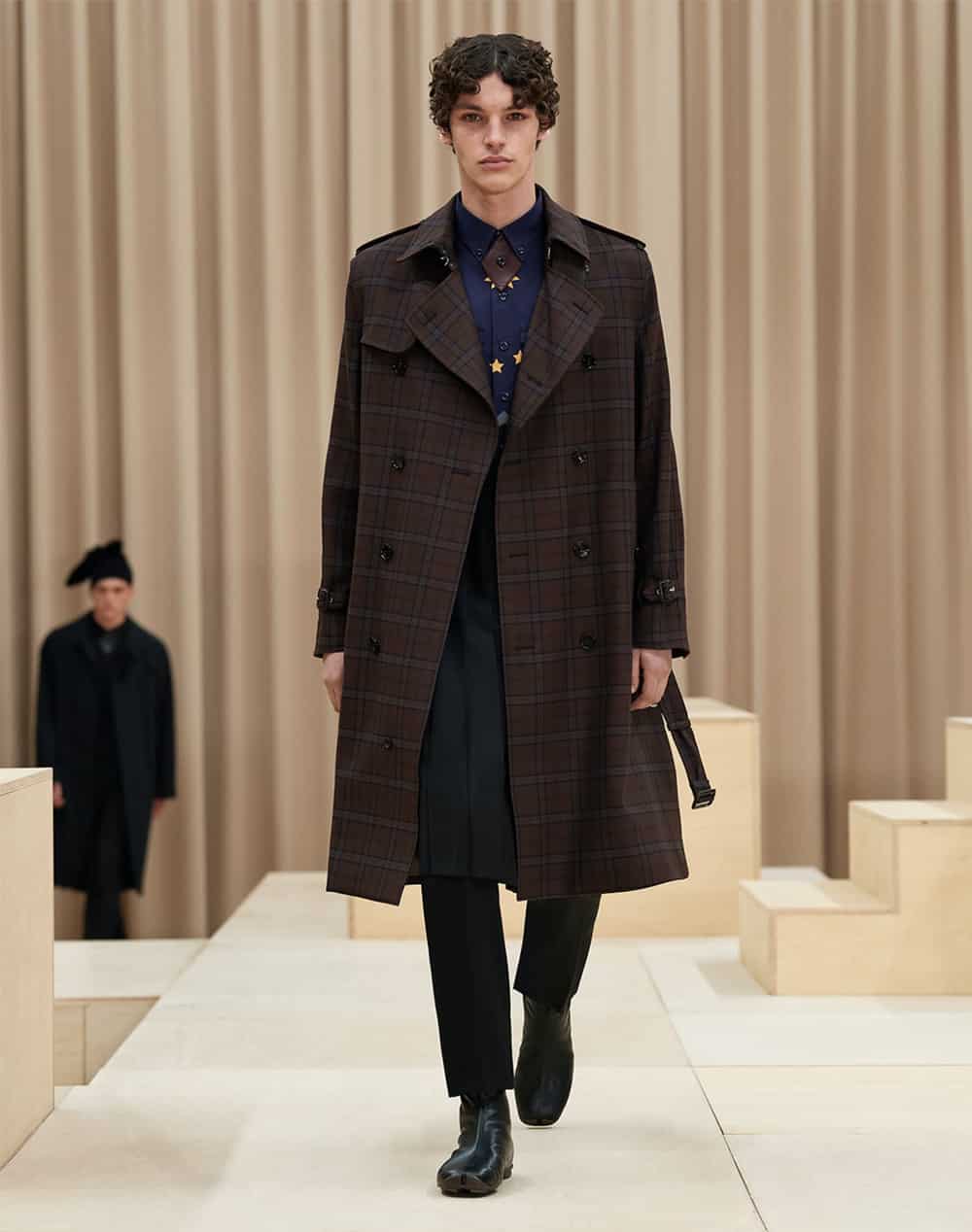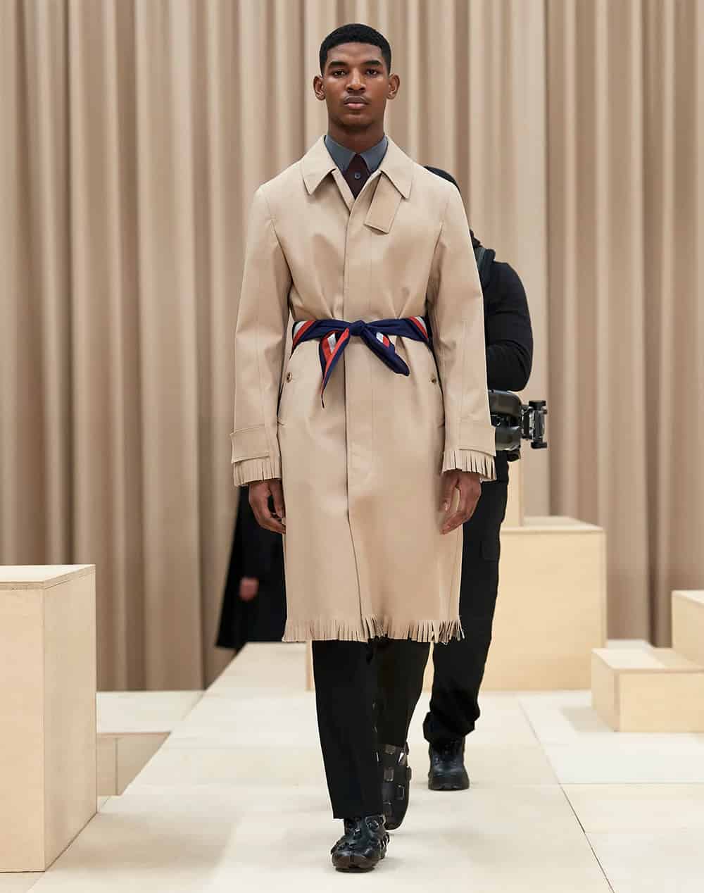 Само шоу (без зрителей) прошло во флагманском бутике Burberry на Риджент-стрит, пустующем из-за бесконечных ковидных ограничений. Эту коллекцию с нетерпением ждали модные критики, ведь это был дебют Тиши – до этого для британского бренда он создавал только женские или смешанные коллекции. Дизайнер назвал это творение Escapes, что объясняется его стремлением к природе. Коллекция отсылает к началу XX века, когда в Великобритании появилась некая субкультура, подразумевающая особую любовь к окружающей среде. Именно она, а также британское ремесленное мастерство, вдохновляли итальянского дизайнера.