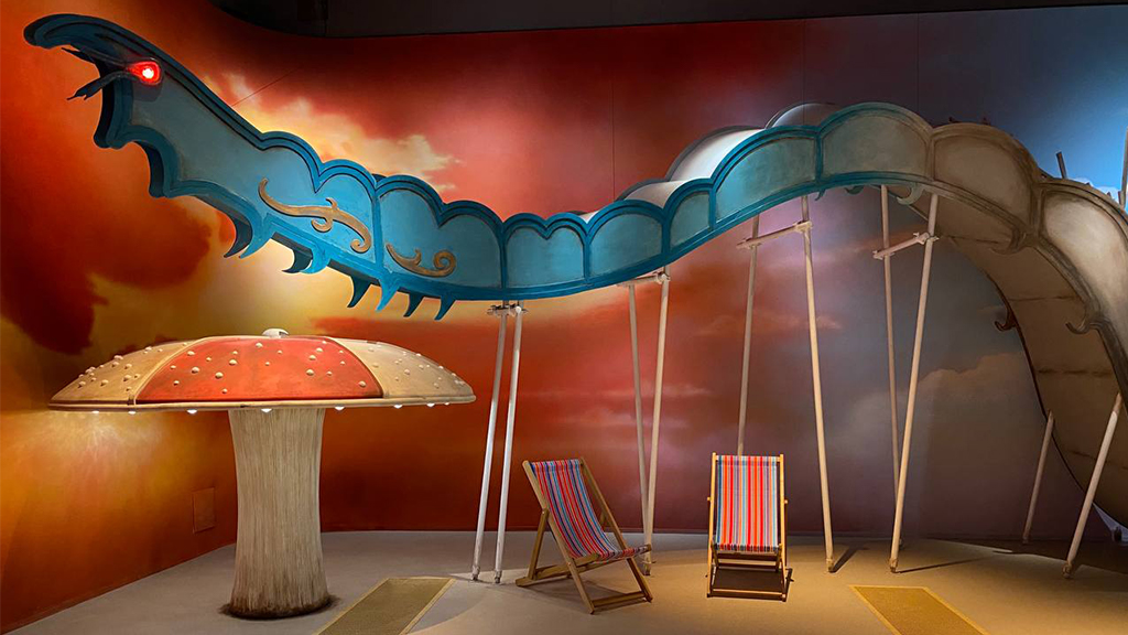 Далее выставка пригласит вас ступить по ту сторону экрана с помощью секции Filming Alice (снимая Алису. – Прим. ред.), посвящённой различным экранизациям сказки. Конечно, центральное место в этой экспозиции заняли две самые известные адаптации – диснеевский мультфильм 1951 года и художественный фильм Тима Бёртона 2010 года. Вы узнаете, что послужило вдохновением при создании культовых костюмов для этих экранизаций, какой вклад Кристиан Диор внёс в формирование образа главной героини и как создавались причудливые наряды для фильма Тима Бёртона. Экспозиция рассказывает и о других, менее известных экранизациях «Алисы», в том числе и о самой первой, снятой аж в 1903 году. Не обошлось и без советского мультфильма 1981 года, фрагменты которого также транслируются на выставке. Следующей на вашем пути будет сюрреалистичная секция под названием Reimagining Alice (переосмысляя Алису. – Прим. ред.), где вы станете гостем на чаепитии у Безумного Шляпника. Главный экспонат этого зала – инсталляция со столом, скатерть которого будто улетает в бесконечность и покрыта психоделическими проекциями. «Алиса в Стране чудес» наложила свой отпечаток на творчество таких художников, как Сальвадор Дали, Яёи Кусама, Макс Эрнст и Питер Блейк, подробнее о чём вы как раз и узнаете, погостив у Шляпника.