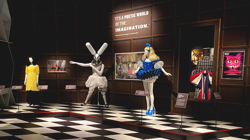 «Алиса в Стране чудес» проникла не только в кинематограф и изобразительное искусство, но и в мир театра, танца и музыки. Экспозиция Staging Alice (ставя Алису. – Прим. ред.) представит вниманию посетителей декорации, костюмы и реквизит, использовавшиеся в наиболее известных театральных постановках сказки Льюиса Кэрролла. Среди экспонатов можно заметить и зарисовку красного платья главной героини в авангардном спектакле Театра на Таганке «Беги, Алиса, беги». Также в этой секции у гостей выставки впервые в истории музея будет возможность погрузиться в виртуальную реальность и сыграть в крокет на том же поле, где Алиса соревновалась с Червонной Королевой. Ранее Музей Виктории и Альберта никогда не включал виртуальную реальность в свои выставки. Вся графика, использующаяся в «игре в крокет», была создана специально по заказу музея исландской художницей Кристьяной Уильямс. Всвязи с пандемией всем посетителям, пожелавшим отправиться в виртуальное путешествие, выдают специальные одноразовые накладки на внутреннюю часть VR-очков.