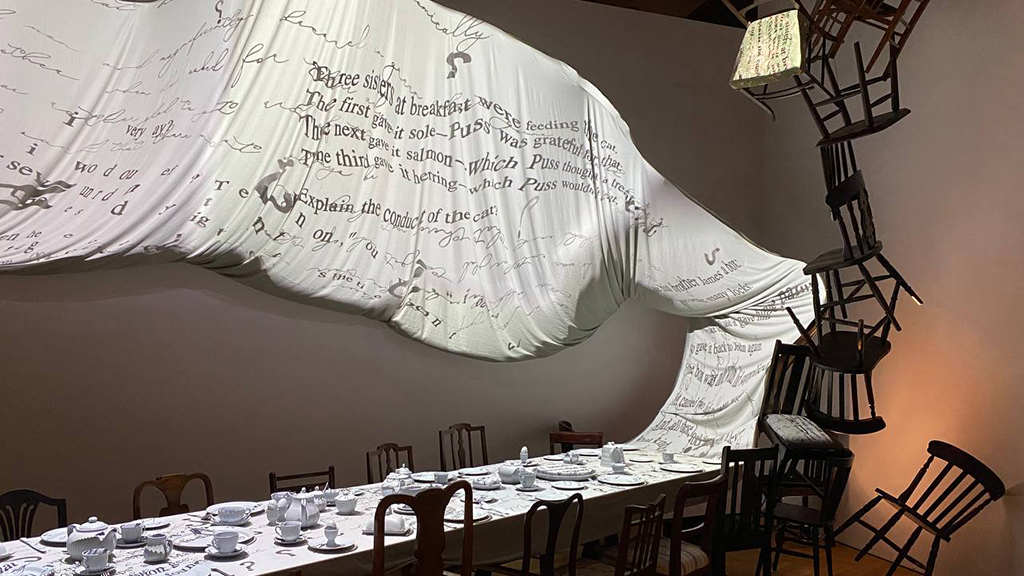 Грандиозная выставка Alice: Curiouser and Curiouser – самый амбициозный подобный проект в истории Музея Виктории и Альберта. Этот музей славится иммерсивными выставками, где старые экспонаты соседствуют с видеоматериалами, проекциями, звуковым сопровождением и световыми эффектами, но на этот раз кураторы действительно превзошли себя. Уже сам вход заставляет посетителей почувствовать, что они и правда следуют за Алисой вглубь кроличьей норы – выставка расположилась в подземных залах Sainsbury Gallery. Экспозиция поделена на пять частей, передвигаясь между которыми вы всё глубже и глубже погружаетесь в Страну чудес, на время оставляя позади повседневную реальность. Начинается выставка с секции Creating Alice (создавая Алису. – Прим. ред.), которая рассказывает историю реальной девочки, вдохновившей Льюиса Кэрролла на создание одной из самых популярных сказок в истории мировой литературы. Вы перенесётесь во времени в викторианский Оксфорд, узнаете, какие реальные места и люди повлияли на писателя, а также познакомитесь с историей сотрудничества Кэрролла и художника Джона Тенниела, создавшего канонические иллюстрации к книгам о приключениях Алисы. Так как идея сказки пришла к писателю во время лодочной прогулки, экспозицию сопровождают звуки воды, бьющейся о борт. К слову, звуковые эффекты очень активно используются на этой выставке, способствуя полному погружению в мир Алисы.