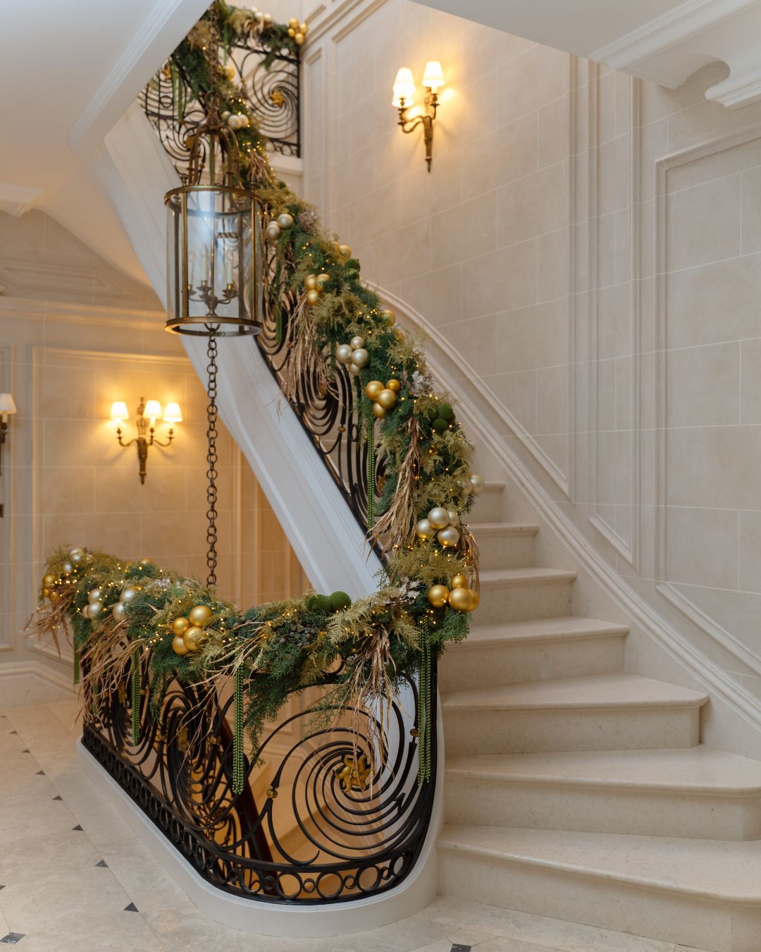 С XIII века зелёные ветви перебрались внутрь дома, а в викторианскую эпоху стали обязательным элементом рождественского сценария. Англичане всегда знали: лестница — это первое, что видят гости, значит именно она задаёт праздничный тон. В больших домах гирлянды плели из ели и сосны, вплетая апельсины, орехи, ленты и даже маленькие свечи. Это был настоящий флористический спектакль. К XX веку традиция стала повсеместной: даже небольшие лондонские таунхаусы декорируют перила, будто ждут саму королеву Викторию.