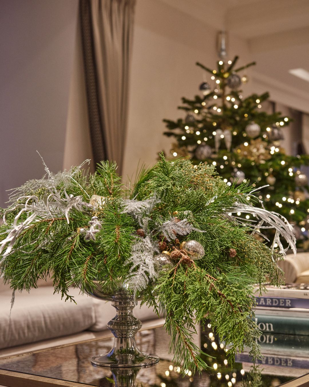 Англичане знают: настроение рождается из мелочей. Мини-букеты в ванной, спокойная флористика в спальнях, крупные зимние композиции в холле и кухне. Так дом превращается в маленькую рождественскую вселенную — не одну «главную» комнату с ёлкой, а пространство, где праздник дышит в каждом углу.