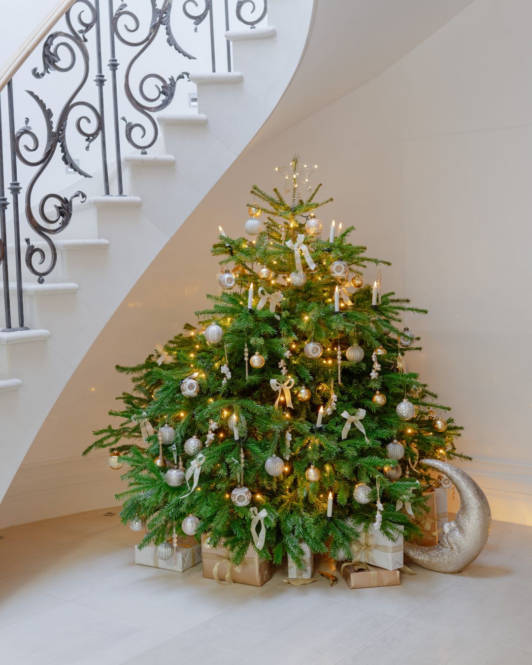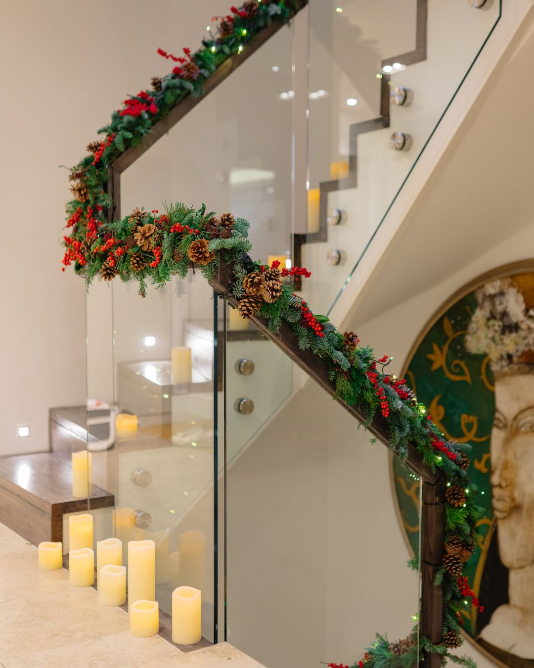 • Для роскошного натурального стиля накладывайте отдельные ветки хвои прямо на перила лестницы. Их понадобится немало, но результат стоит усилий. Смешивайте разные виды вечнозелёных растений: оттенки, формы и текстуры создают богатую визуальную картинку и узнаваемый зимний аромат. Отлично подходят сорта Scott’s pine, Arizona conifer, Cypress, Kiefer pine, Nobilis pine и другие.