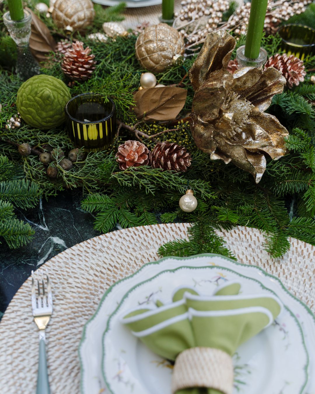 • Добавьте шишки, мандарины, веточки хвои или другие декоративные элементы каждому на салфетку, перевяжите салфетки бархатными или шифоновыми лентами.