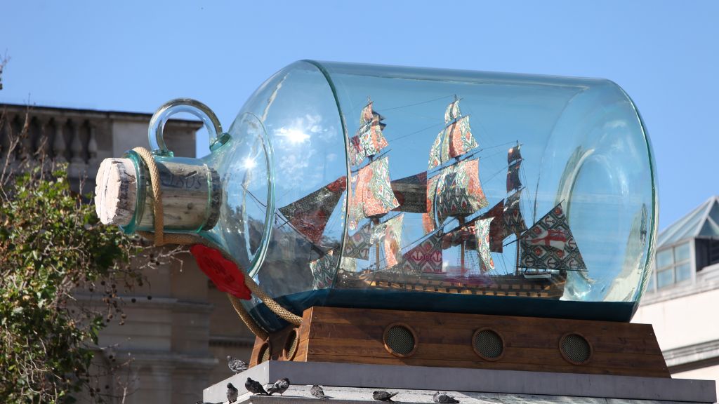 Корабль адмирала Нельсона в гигантской бутылке, с парусами из африканского текстиля. Одна из самых любимых работ публики — размышление о колониализме и британской истории.