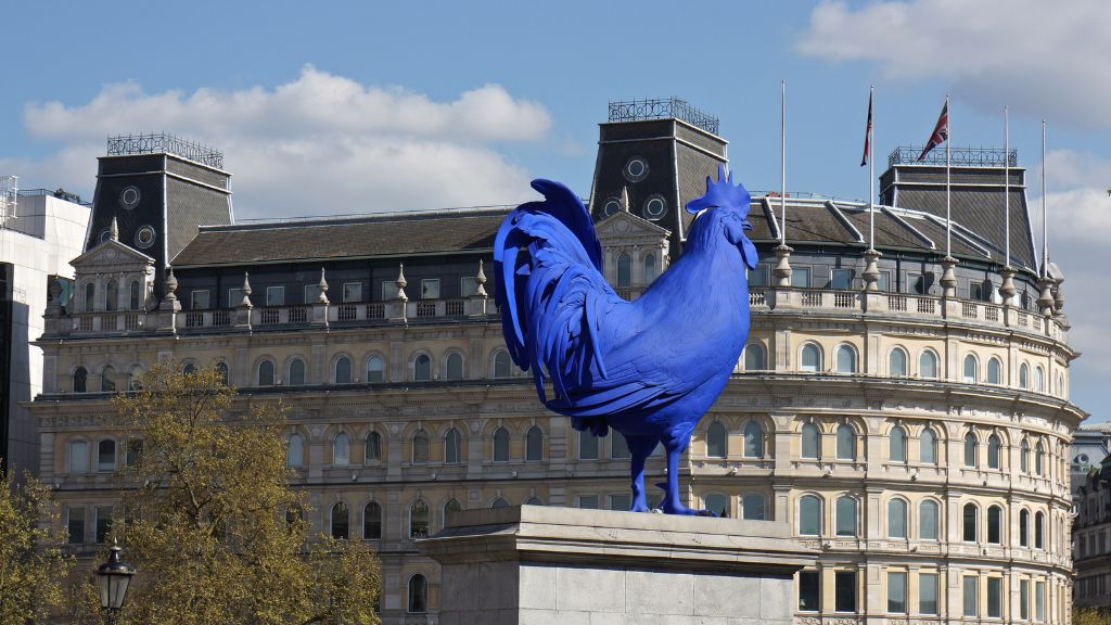 Гигантский синий петух. Ироничный комментарий к мужскому героическому пантеону площади.