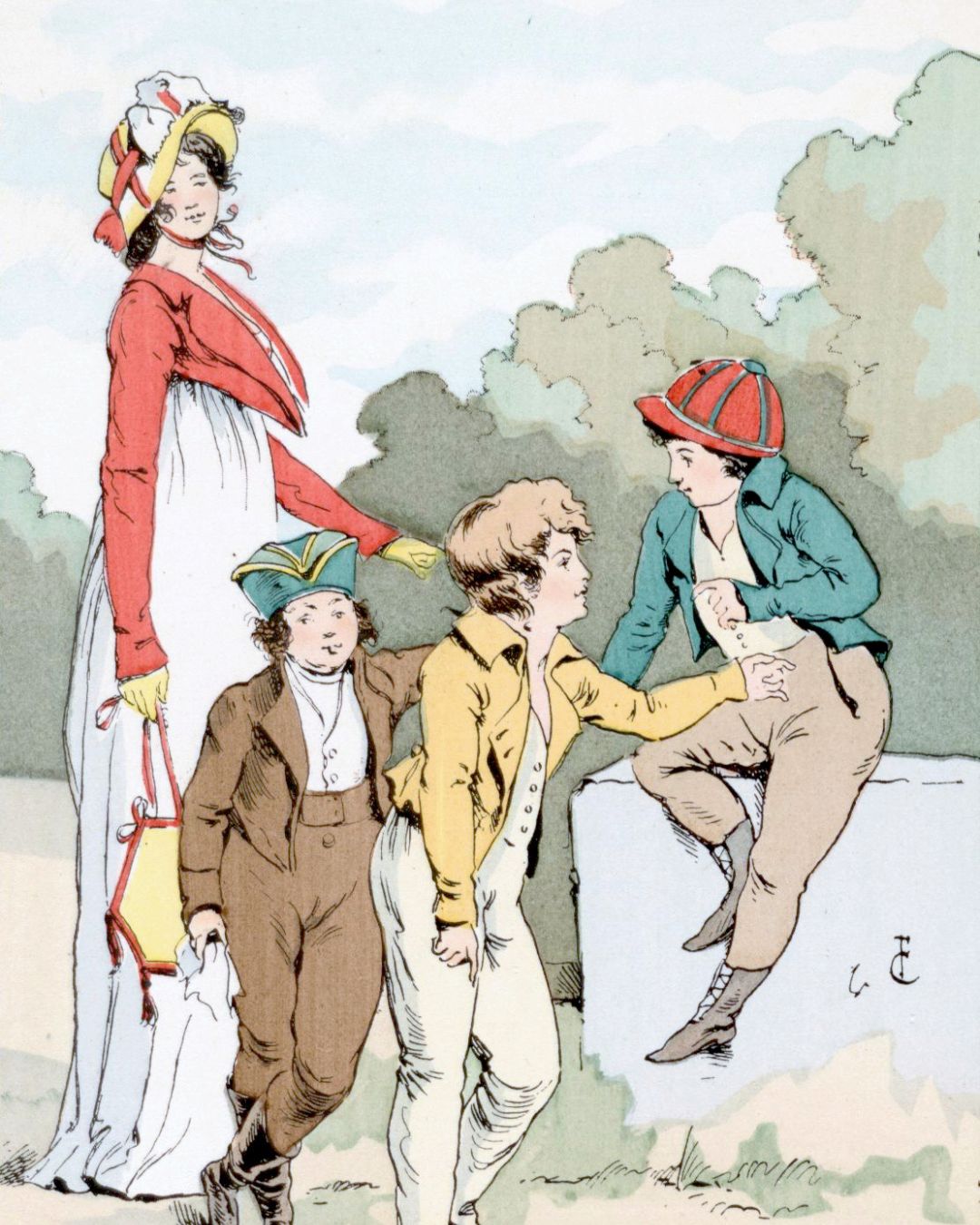 - Цветная гравюра 1800 г., изображающая женщину в жакете Spencer с тремя мальчиками. Фото: François Courboin, Public domain, via Wikimedia Commons