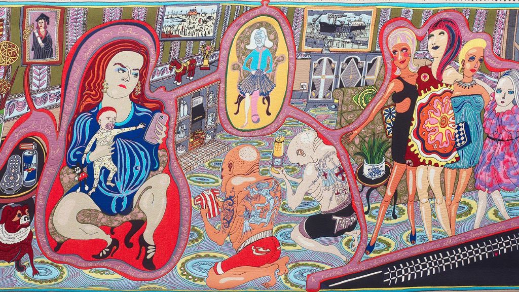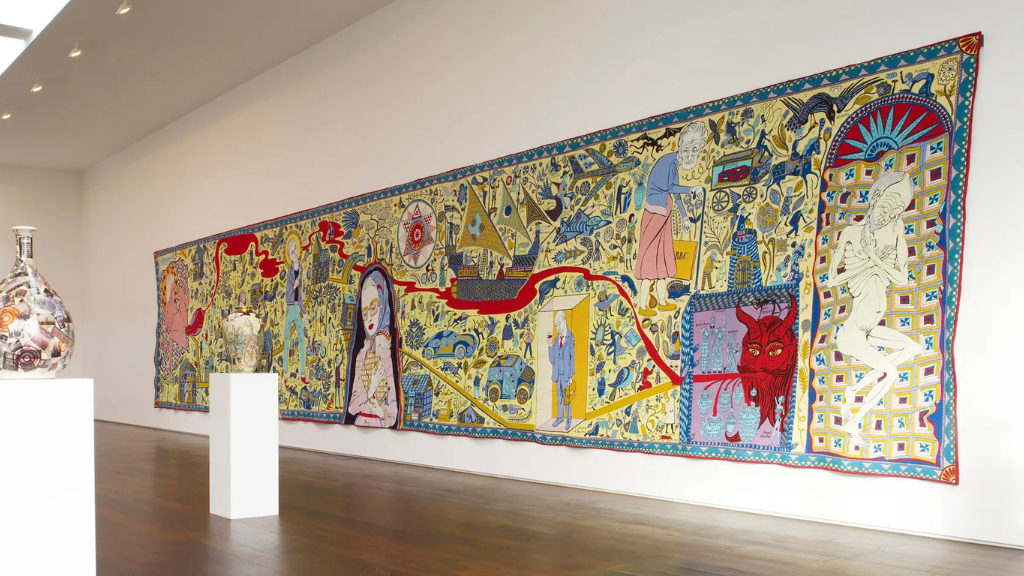 Текстиль ещё один любимый материал художника. Его масштабные гобелены сочетают социальную сатиру, личные истории и наблюдения о классе — теме, к которой художник возвращается вновь и вновь. Один из ключевых проектов — The Walthamstow Tapestry (2009), полотно длиной 15 метров. На нём Перри выстраивает визуальную биографию человека — от рождения до смерти — окружённую сотнями брендов, формирующих идентичность. Это своего рода хроника общества потребления, где логотипы становятся новыми символами веры.