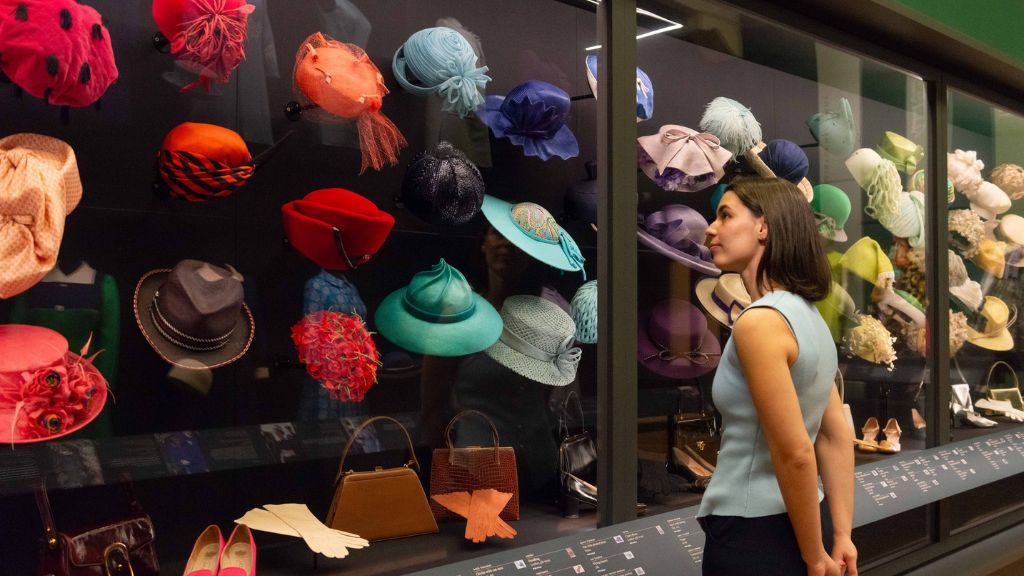 Шляпы, без которых этот образ невозможно представить, создавали мастера британского миллинери – прежде всего Фредерик Фокс и позднее Филип Сомервилл. Благодаря им в гардеробе появились и лаконичные береты шестидесятых, и скульптурные формы восьмидесятых и девяностых. Более пятидесяти шляп выстроены как самостоятельная линия дизайна: от мягкой графики к почти архитектурным силуэтам.